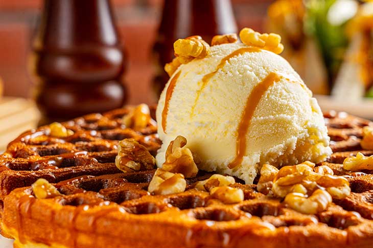 以溫熱鬆餅佐香草冰淇淋與濃郁焦糖,帶來冰火交融幸福滋味。