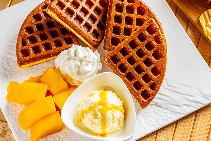 堆滿了當季新鮮芒果,每一塊都切得大氣又飽滿,再加上一球香草冰淇淋,簡直是輕奢等級的享受。鬆餅口感紮實,搭配清甜的芒果和冰涼的冰淇淋,冷熱交織,甜而不膩,滿滿的澎湃感。